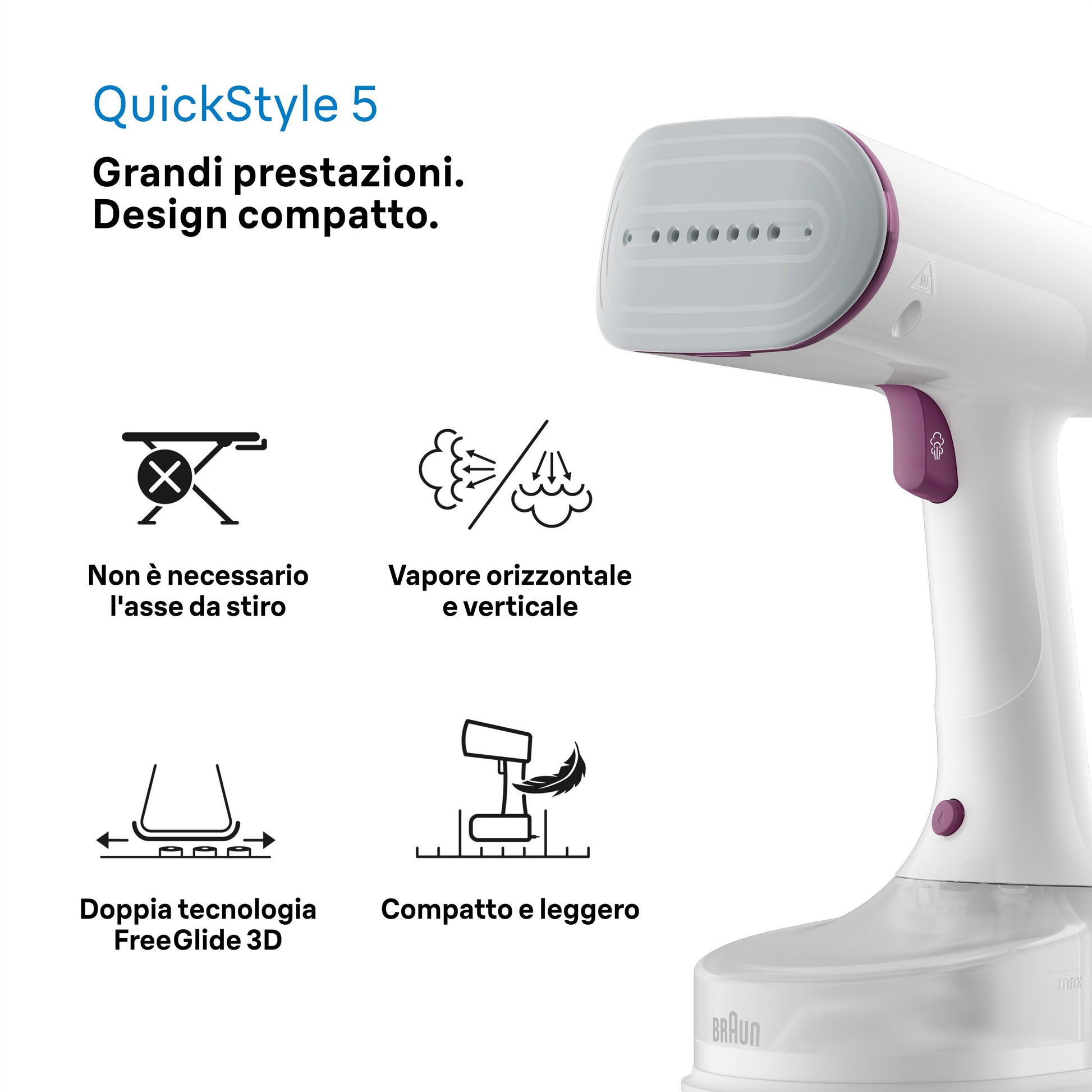 Prestazioni eccezionali. Design compatto.\nGoditi una stiratura rapida e senza problemi grazie alla tecnologia FastSteam. Con 1200 watt di potenza, QuickStyle 5 eroga fino a 25 g/min di vapore continuo per rimuovere le pieghe in modo rapido e semplice. Comodo da riporre grazie al suo design compatto, è dotato anche di iCare Tecnology per proteggere i tuoi capi da bruciature o danni durante l’utilizzo. Inoltre, questa soluzione 2 in 1 offre la versatilità necessaria per eliminare rapidamente le pieghe, sia in orizzontale che in verticale. Per stirare i tuoi abiti basta appenderli a una gruccia o stenderli su un letto o un tavolo.\n\nTecnologia FastSteam\nVapore potente per una facile e veloce rimozione delle pieghe e miscelazione della vaporizzazione dell’acqua per una finitura perfetta.\n\nLa prima tecnologia al mondo Dual FreeGlide 3D\nLa sua esclusiva piastra curvata verso l’alto su entrambi i lati garantisce un’elevata scorrevolezza a 360°. Scivola su qualsiasi ostacolo come bottoni e tasche, senza rimanere bloccato.\n\nVapore in orizzontale e verticale\nElimina rapidamente le pieghe, in orizzontale o in verticale. Per stirare i tuoi abiti basta appenderli a una gruccia o stenderli su un letto o un tavolo.\n\nRiscaldamento rapido\nPrepararsi è ancora più facile e veloce: basta collegare la spina e il QuickStyle 5 è pronto a erogare vapore in soli 45 secondi.\n\nCompatto e leggero\nDesign ergonomico e leggero per una facilità d’utilizzo, i nostri stiratori verticali sono comodi per stirare in qualsiasi posizione. Grazie al design compatto è anche comodo da riporre.\n\nNessun asse da stiro necessario\nRimuovi velocemente le pieghe senza dover prima montare un asse da stiro. Stira semplicemente i capi appesi verticalmente o stesi orizzontalmente su un letto per un look perfetto in pochissimo tempo.\n\nModalità Smart iCare Tecnology per tutti i tipi di tessuto stirabile\nLa modalità Smart iCare Tecnology protegge i vestiti con una temperatura sicura. Vapore più veloce e più facile.