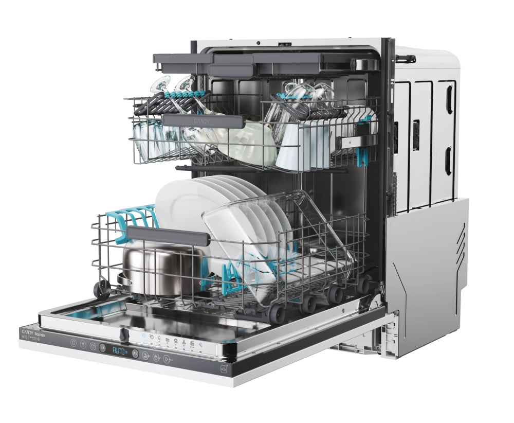 |La nuova Candy Rapido' ha la vasca più spaziosa del mercato (in formato standard) che offre la massima capienza per le stoviglie, anche le più grandi come teglie da forno, taglieri e insalatiere.