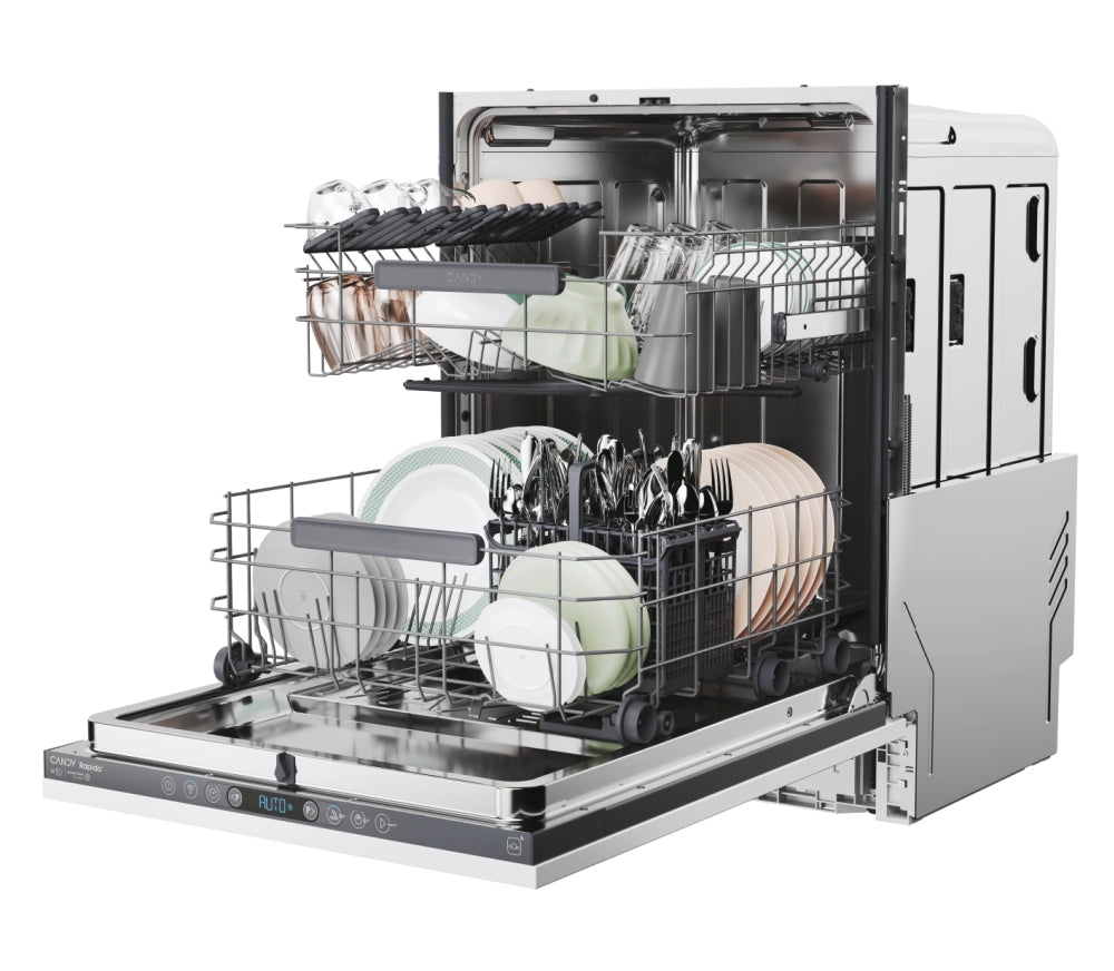 |La nuova Candy Rapido' ha la vasca più spaziosa del mercato (in formato standard) che offre la massima capienza per le stoviglie, anche le più grandi come teglie da forno, taglieri e insalatiere.