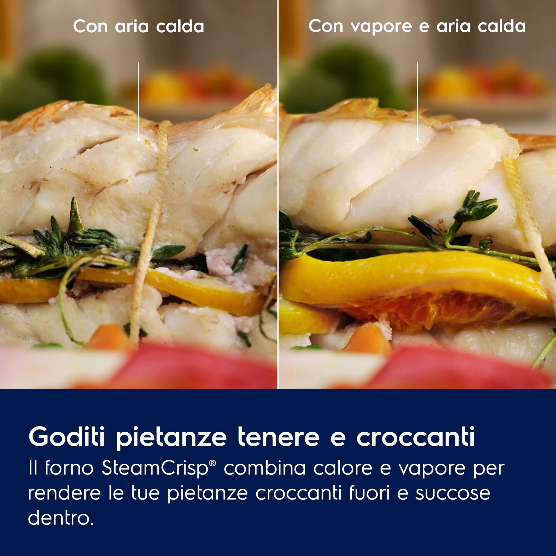 Il forno multifunzione SteamCrisp® combina calore e vapore per cuocere e arrostire. Questa combinazione mantiene i piatti croccanti all’esterno e succosi all’interno: la carne è più succosa e il pesce è più tenero, fino al 20% in più rispetto alla cottura in un forno non a vapore.