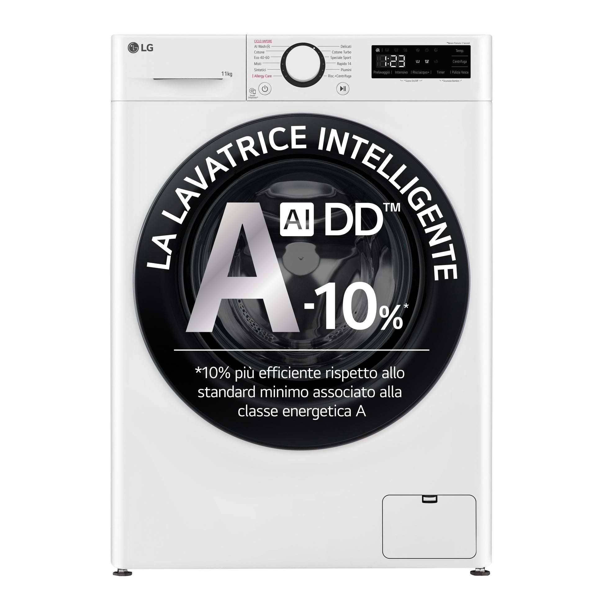 Risparmia più energia\nAbbiamo a cuore l'efficienza dei nostri elettrodomestici, in modo che possano pesare il meno possibile sulla tua bolletta dell'energia elettrica. Questa lavatrice ti offre un'efficienza elevatissima, perché è il 10%* più efficiente rispetto a quelle tradizionali in classe A.\n\n*Il 10% più basso dell'indice di efficienza energetica rispetto allo standard minimo associato alla classe di efficienza energetica A per le lavatrici\n\nLava fino a 11kg di bucato in soli 56,5cm\nQuesta lavatrice ha la profondità standard di 56,6cm, ma ti permette di lavare fino a 11kg di bucato grazie al cestello interno di grandi dimensioni. Una vera comodità se hai bisogno di lavare tanti indumenti ma non hai spazio in casa per installare una lavatrice maxi. In questo modo potrai fare il bucato in meno cicli, risparmiando tempo ed energia.\n\nTecnologia AI DD™\nL'Intelligenza Artificiale della lavatrice non si limita a rilevare il peso dei vestiti nel cestello, ma identifica anche la tipologia dei tessuti in modo da scegliere autonomamente i movimenti ottimali per ogni lavaggio fra 20.000 combinazioni diverse. In questo modo i tuoi capi saranno trattati con una cura superiore del 18%*, facendoli durare più a lungo.\n\n*Testato da Intertek a marzo 2019. Ciclo Cotone con 2 kg di biancheria intima confrontato con il ciclo Cotone tradizionale di LG (FC1450S2W). I risultati possono variare a seconda dei capi e dell’ambiente.\n*AI Direct Drive è disponibile in 3 cicli (Cotone, Tessuti misti, Easy Care).\n\nLavaggio a vapore Steam\nIl lavaggio a vapore è utilissimo per igienizzare i tuoi capi, eliminando così germi, batteri e allergeni. Il vapore permette anche di distendere meglio le fibre in modo da migliorare l'efficacia del lavaggio.\n\nCestello a bolle\nIl cestello di questa lavatrice ha la superficie ""a bolle"", una particolare conformazione che permette di salvaguardare i tessuti evitando l'eccessivo sfregamento col cestello durante il lavaggio e la centrifuga.\n\nMotore Inverter Direct Drive™ garantito 10 anni\nIl motore Inverter Direct Drive™ è un brevetto di LG e si differenzia dai motori tradizionali perché è collegato direttamente al cestello. Una soluzione molto più affidabile nel tempo - perché vengono eliminati componenti soggetti a usura come cinghia e puleggia - e che permette di gestire i movimenti del cestello con maggior precisione per migliorare l'efficacia del lavaggio.\n\nProgramma Allergy Care\nIl programma dedicato Allergy Care è molto utile se in famiglia qualcuno soffre di problemi allergici. Grazie al lavaggio ad alte temperature, questo programma riduce del 99,9% gli acari della polvere responsabili di allergie o problemi respiratori. Il ciclo Allergy Care è stato approvato dalla BAF (British Allergy Foundation) proprio per la sua capacità di ridurre gli acari della polvere domestica del 99,9%.\n\nAgitatori in acciaio inox\nGli agitatori in acciaio inox garantiscono la massima igiene nel cestello evitando la formazione di muffe e batteri. Rispetto ai normali agitatori in plastica, infatti, l'acciaio inox è un materiale più igienico, ideale per mantenere un ambiente più salubre all'interno del cestello.\n\n