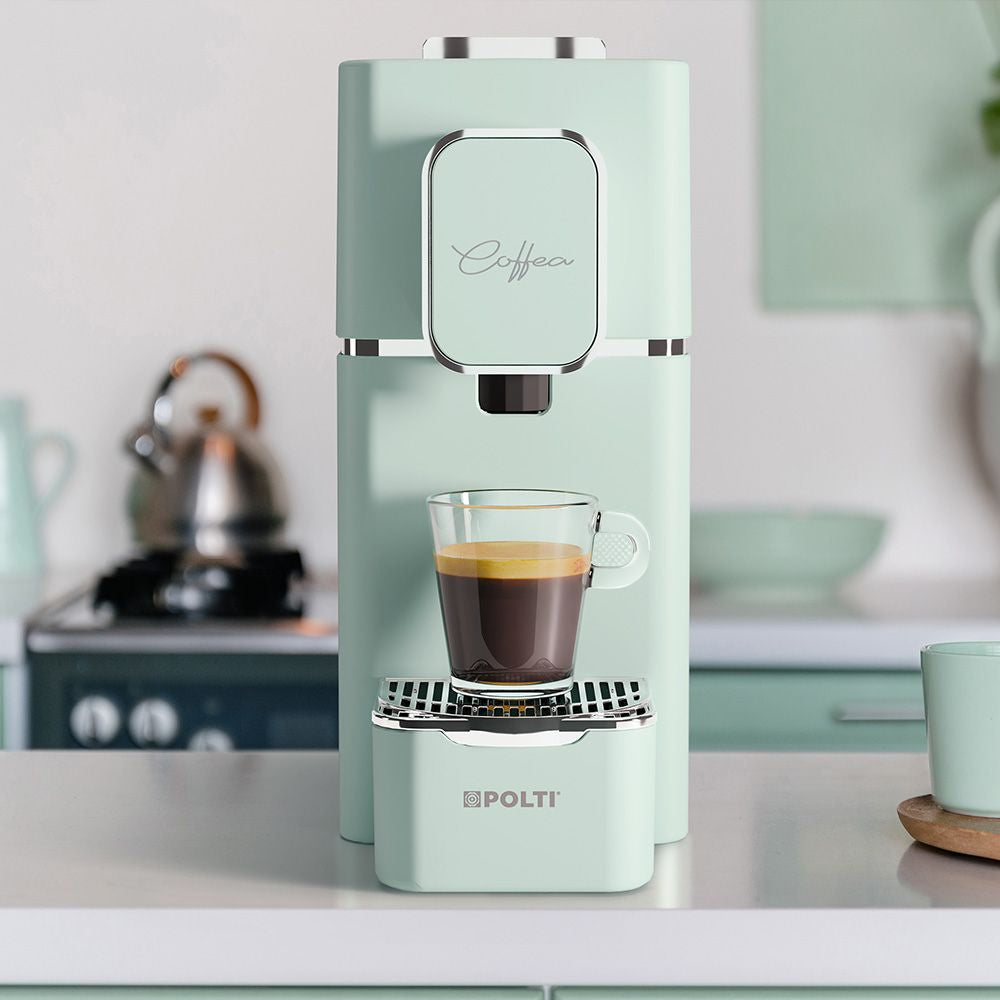 Polti Coffea S15G, macchina da caffè espresso compatibile con cialde E.S.E. da 44 mm, ora disponibile in elegante verde. Personalizza erogazione e temperatura per un espresso perfetto, come al bar, direttamente a casa.\n\nIl suo design compatto e le finiture raffinate la rendono l'aggiunta ideale alla vostra casa.\n\nGusta tutto il piacere del caffè in cialda\nLasciati conquistare da un’esperienza di gusto intensa e cremosa. Il caffè in cialde ti regala un aroma autentico, come quello del bar. Polti Coffea è compatibile con cialde E.S.E. da 44 mm.\n\nScegli la quantità del tuo caffè\nGrazie ai due tasti programmabili, puoi decidere la lunghezza del tuo caffè: corto, lungo o interrompere l’erogazione quando preferisci.\n\nRisparmio energetico intelligente\nCon la funzione di spegnimento automatico dopo 25 minuti, Polti Coffea evita inutili sprechi di energia elettrica.\n\nIgiene e comodità in un solo gesto\nAprendo la serrandina, la cialda viene espulsa automaticamente, senza bisogno di toccarla con le mani.\n\nSerbatoio pratico e capiente\nIl serbatoio da 0,85 litri è facilmente removibile, rendendo semplice sia il riempimento che la pulizia con acqua corrente.\n\nLa temperatura giusta per te\nCon Polti Coffea puoi scegliere tra tre livelli di temperatura per gustare il caffè esattamente come piace a te.