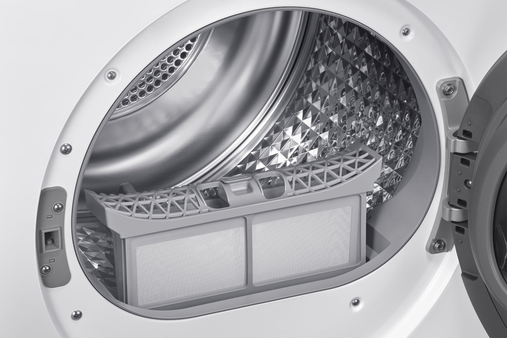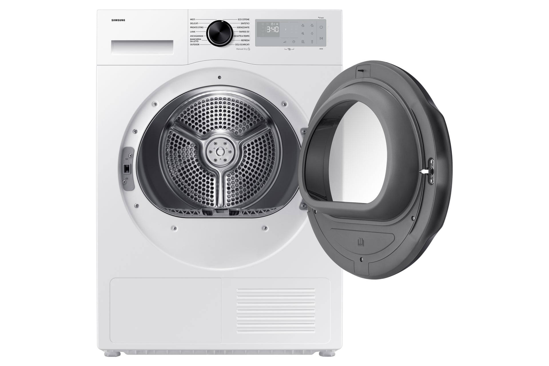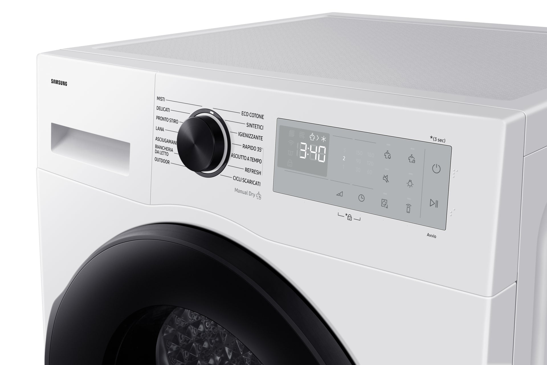 Fino al 99,9% di sanificazione<sup>[2]</sup> \nProgramma Igienizzante\nPrevieni laccumulo dei batteri su indumenti, lenzuola, peluche e altri prodotti tessili con il Programma Igienizzante, che sanifica carichi asciutti e bagnati indistintamente<sup>[1]</sup> senza compromettere le prestazioni dellasciugatrice. Il calore elevato emesso durante lasciugatura è in grado di eliminare il 99,9% dei batteri<sup>[2]</sup>.\n\nMassima flessibilità\nPorta reversibile\nPersonalizza in modo semplice e veloce la direzione di apertura dell'oblò in base alle tue esigenze ed allo spazio a disposizione per la tua asciugatrice. Ottieni il massimo del comfort in base alle tue abitudini di lavaggio e asciugatura. Inoltre, grazie al pratico oblò trasparente, controlli in un attimo i tuoi capi all''interno dell'asciugatrice.\n\nCapi senza pieghe\nStiro facile\nElimina la formazione delle pieghe dai tessuti, senza l'utilizzo del ferro da stiro. Grazie alla funzione Stiro Facile, una volta che il ciclo di asciugatura è finito, il cestello compie dei movimenti intermittenti per 180 minuti, distendendo le pieghe dai tessuti. In questo modo si evita che i capi restino nella stessa posizione troppo a lungo e si previene la formazione delle grinze dai tessuti, per capi pronti da indossare.\n\nManutenzione semplice\nFiltro 2 in 1\nPrendersi cura dell'asciugatrice e migliorarne prestazioni e sicurezza non è mai stato così facile. La maglia a doppio strato del filtro 2-in-1 trattiene polvere e fibre, sostituendo il foltro dello scambiatore di calore - un vantaggio anche per la manutenzione. Due allarmi, inoltre, ti avviseranno quando è il momento di pulire filtro e scambiatore di calore.\n\nRinfresca i tuoi capi\nAir Refresh\nDai una rinfrescata ai tuoi capi senza lavare, bollire, sfregare o consumare detersivo. La tecnologia Air Refresh profuma gli indumenti e la biancheria da letto, in modo che abbiano sempre un odore fresco. Gli odori sgradevoli vengono eliminati utilizzando solo aria super-calda. I tuoi abiti sembreranno lavati a secco e dureranno più a lungo.\n\nPerformante e affidabile\nTecnologia Digital Inverter\nLa tecnologia Digital Inverter sfrutta dei solidi magneti che consentono di ottenere i risultati desiderati in maniera efficace e silenziosa, consumando meno energia<sup>[3]</sup> rispetto a un motore universale. Questo, inoltre, è il motore più duraturo del settore, coperto da una garanzia di 20 anni<sup>[3]</sup>.\n\nAsciuga meno, consuma meno\nOptimalDry\nOttimizza le prestazioni di asciugatura senza sforzo! La tecnologia Optimal Dry ti offre riusultati insuperabili, grazie ai suoi 3 sensori che monitoeano l'umidità e regolano il tempo di asciugatura: il bucato sarà pronto rapidamente e con un dispendio energetico minimo. In più, evita che i tessuti si danneggino e ti ricorda di pulire lo scambiatore di calore.\n\nAsciutto in tempo record\nQuick Dry 35'\nAssicurati il tuo outfit preferito asciutto e pronto da indossare in tempi record. Con il programma Rapido 35' ottieni fino a 1 Kg di bucato asciutto in soli 35 minuti<sup>[4]</sup>. Il tuo abito preferito o la tua camicia saranno sempre pronti, quando lo decidi tu.\n\nSempre connessi grazie a SmartThings\nWi-Fi integrato\nTrasforma l'asciugatura in un'operazione semplice ed efficiente con l'app SmartThings<sup>[5]</sup> "Energy" ti aiuta a gestire l'energia. "Home Care" mantiene l'asciugatrice in condizioni sempre ottimali. E, una volta termiinato il lavaggio nella lavatrice abbinata, ti basta premere il pulsante Smart Link sull'asciugatrice<sup>[6]</sup> per farti consigliare il ciclo ideale.\n\nSmartThings Energy con AI Energy Mode\nPer risparmiare energia, ci vuole intelligenza\nGestisci i consumi di energia per ridurre le emissioni di anidride carbonica e risparmiare denaro. SmartThing Energy<sup>[7]</sup> fornisce consigli su come utilizzare l'energia in modo efficiente, monitora i consumi dei tuoi elettrodomestici in tempo reale, confrontandoli con quelli del mese precedente, e ti avvisa se i tuoi target mensili potrebbero essere superati.\n\nSmartThings Home Life\nAsciuga come vuoi tu\nPrendersi cura dell'asciugatrice o della lavatrice è più facile che mai. SmartThings Home Care<sup>[8]</sup> ti avvisa quando è necessario sostituire un componente, ti aiuta a trovare le cause dei problemi e ti spiega come aggiornare il software di dispositivi e servizi. Oltre a manuale utente, questa pratica funzione offre anche consigli utili per impiegare al meglio il tuo elettrodomestico.