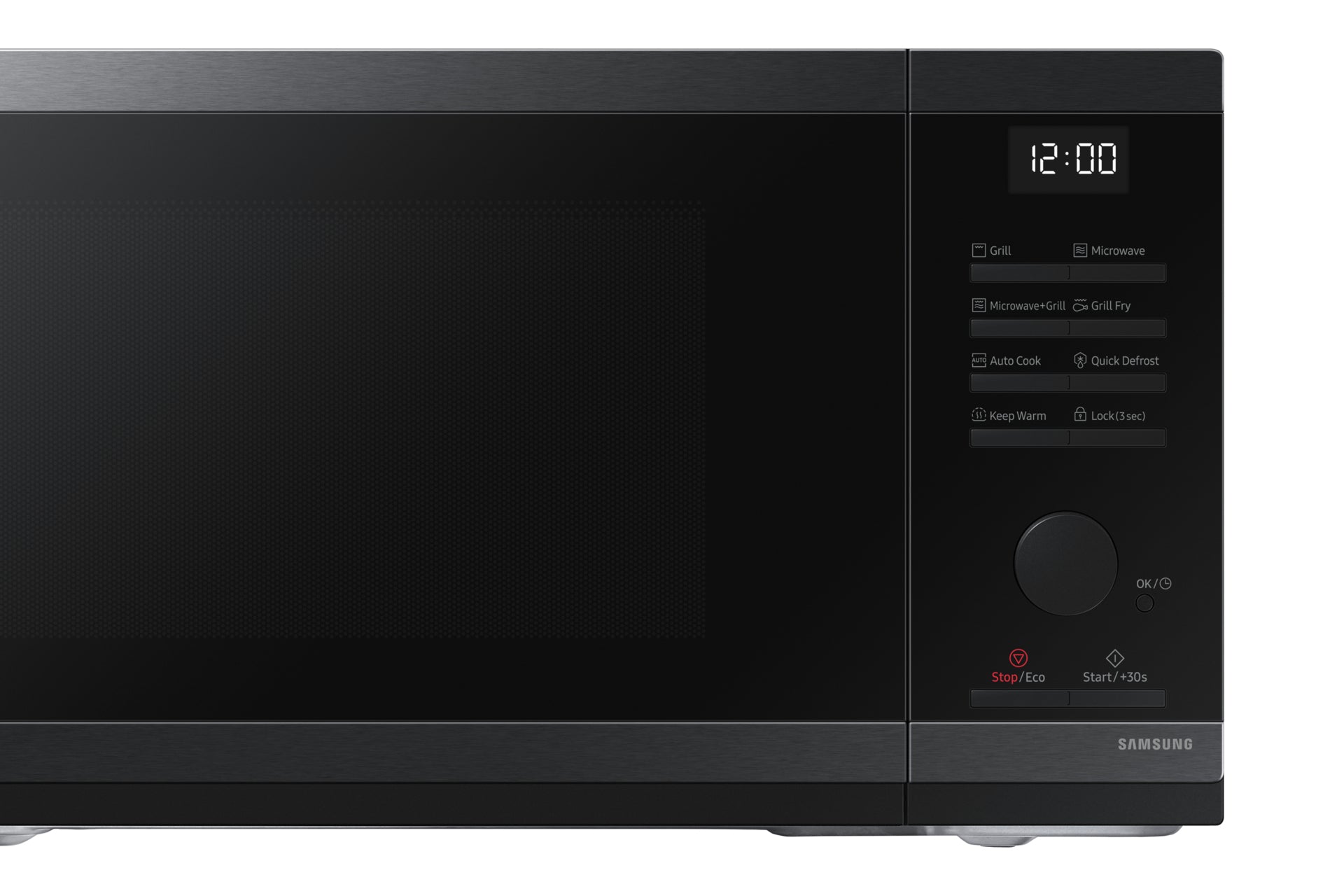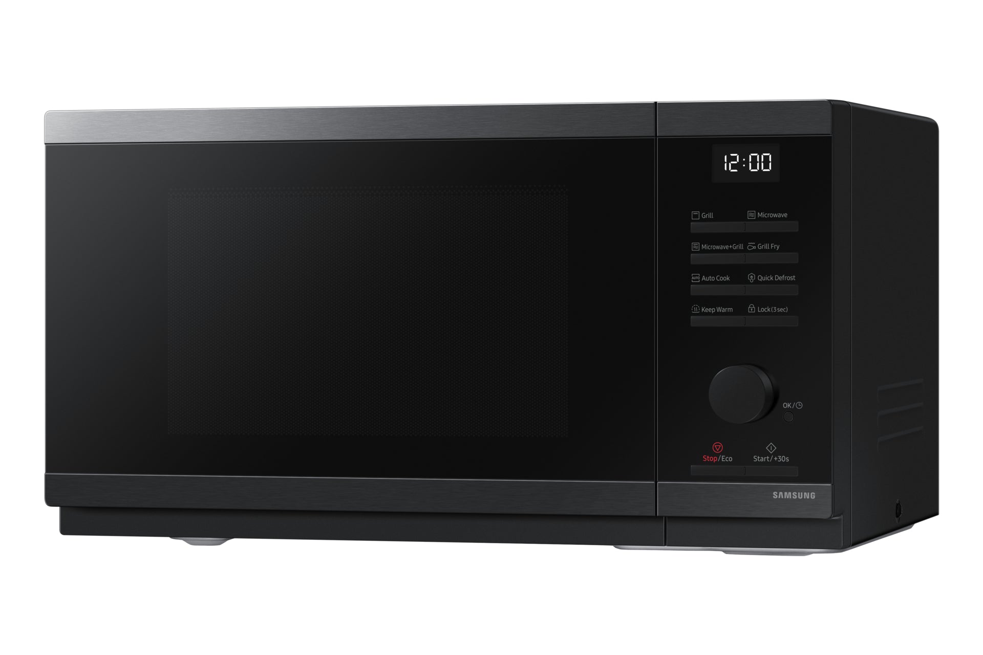 Croccantezza irresistibile\nPiatto doratore\nDorature perfette anche senza forno. La funzione Frittura ad Aria (con Piatto Doratore) cuoce e griglia per gustare tutto il sapore e la consistenza non solo dei cibi congelati pronti da cuocere - come ad esempio le cotolette di pesce - ma anche di alimenti freschi come il pollo. Non utilizza olio, quindi le pietanze preparate saranno più sane.\n\nScongela il pane in pochi minuti\nScongelamento pane\nScongela il pane in modo facile e veloce, per gustarlo in tutta la sua freschezza. Ti basta premere un pulsante e la funzione Bread Defrost calcolerà il tempo e la temperatura ottimali per scongelare pane, dolci e panini surgelati. Il programma utilizza infine il grill per rendere il pane come appena sfornato.\n\nDesign pulito e moderno\nManiglia a incasso senza saldature\nPer una cucina moderna e allavanguardia, con un microonde dallaspetto pulito ed elegante. Grazie al design flat, la porta del microonde ha un aspetto discreto ed elegante, con dei dettagli in acciaio inox nero e dotata di maniglie a incasso nella parte superiore e inferiore. Questa soluzione non presenta sporgenze e consente di aprire comodamente la porta con entrambe le maniglie.\n\nDurata eccezionale e massima praticità\nPotente Grill rivestito in metallo\nCucina in modo semplice e più a lungo. Il grill è realizzato in metallo ed è dotato di un'ottima resistenza agli urti. Per questo motivo, non è necessario rivestirlo con una protezione ed è anche più facile da pulire.\n\nScongela tutto in un attimo\nQuick Defrost\nScongela rapidamente gli alimenti surgelati con la funzione Scongelamento rapido. Potrai scongelare in un attimo 5 tipi di alimenti tra i più diffusi: carne, pollo, pesce, verdure e pane. Ti basterà selezionare il tipo di pietanza e il relativo peso, e il microonde calcolerà il tempo di scongelamento ottimale. In questo modo potrai preparare qualsiasi piatto in poco tempo, mantenendo intatti il sapore e le proprietà nutritive degli ingredienti.\n\nSuperficie interna 99,9% antibatterica e facile da pulire\nCERAMIC INSIDE™\nPulizia semplice e immediata dopo ogni preparazione. Il rivestimento ultra-resistente CERAMIC INSIDE™ può essere pulito senza rischio di graffiarlo e non scolorisce<sup>[1]</sup>. L'istituto di ricerca tedesco Hohenstein ha certificato per lo "smalto del forno a microonde" un'attività antibatterica pari al 99,9%<sup>[2]</sup>. Inoltre, questa superficie è circa 24 volte più resistente ai graffi dell'acciaio inossidabile<sup>[3]</sup>.\n\nComandi di cottura semplici e intuitivi\nManopola di controllo: tante funzioni a portata di mano\nCucina in modo semplice e pratico. Il pannello di controllo è facilissimo da usare: ti basterà premere pochi pulsanti per controllare le funzioni essenziali che usi più spesso. E con la manopola potrai controllare ogni funzione in modo ancora più semplice e preciso, selezionando e modificando facilmente le impostazioni.\n\nLa dolcezza è di casa\nHome Dessert\nPrepara irresistibili dolci fatti in casa in poco tempo e senza neanche riscaldare il forno. Una volta che hai deciso quale dolce preparare, metti insieme gli ingredienti e seleziona l'opzione Home Dessert. Potrai preparare in modo facile e veloce tantissimi dolci, dal plumcake alle noci al banana bread, ma anche un soffice pan di Spagna, brownies o un delizioso budino.\n\nPrepara ogni piatto alla perfezione\nSistema di distribuzione triplo (TDS)\nPer cucinare nel modo migliore<sup>[4]</sup> qualsiasi pietanza, dalla pizza al latte caldo. Il Sistema di distribuzione triplo<sup>[5]</sup> distribuisce in 3 direzioni le microonde, consentendo loro di raggiungere ogni angolo e penetrare negli alimenti in diversi punti. In questo modo, la cottura sarà più completa e omogenea.\n\nLa massima precisione in cucina\nCottura automatica\nPrepara piatti deliziosi senza lasciare nulla al caso. Con la funzione Cottura automatica potrai preparare 15 pietanze tra le più diffuse, tra cui pollo, pesce e verdure. Per ogni pietanza sono già impostati in modo predefinito il tempo e la temperatura più indicati. Ti basterà selezionare il tipo di pietanze e il relativo peso, e seguire le istruzioni<sup>[6]</sup>.\n\nMeno energia in standby\nModalità ECO\nSpesso non ci si fa caso, ma gli elettrodomestici che rimangono accesi tutto il giorno sprecano tanta energia. Con la modalità Standby potrai ridurre questi consumi di energia<sup>[7]</sup> non necessari. Ad esempio, quando non stai cucinando, il display del forno a microonde viene spento, utilizzando la potenza minima necessaria per rimetterlo in funzione successivamente.