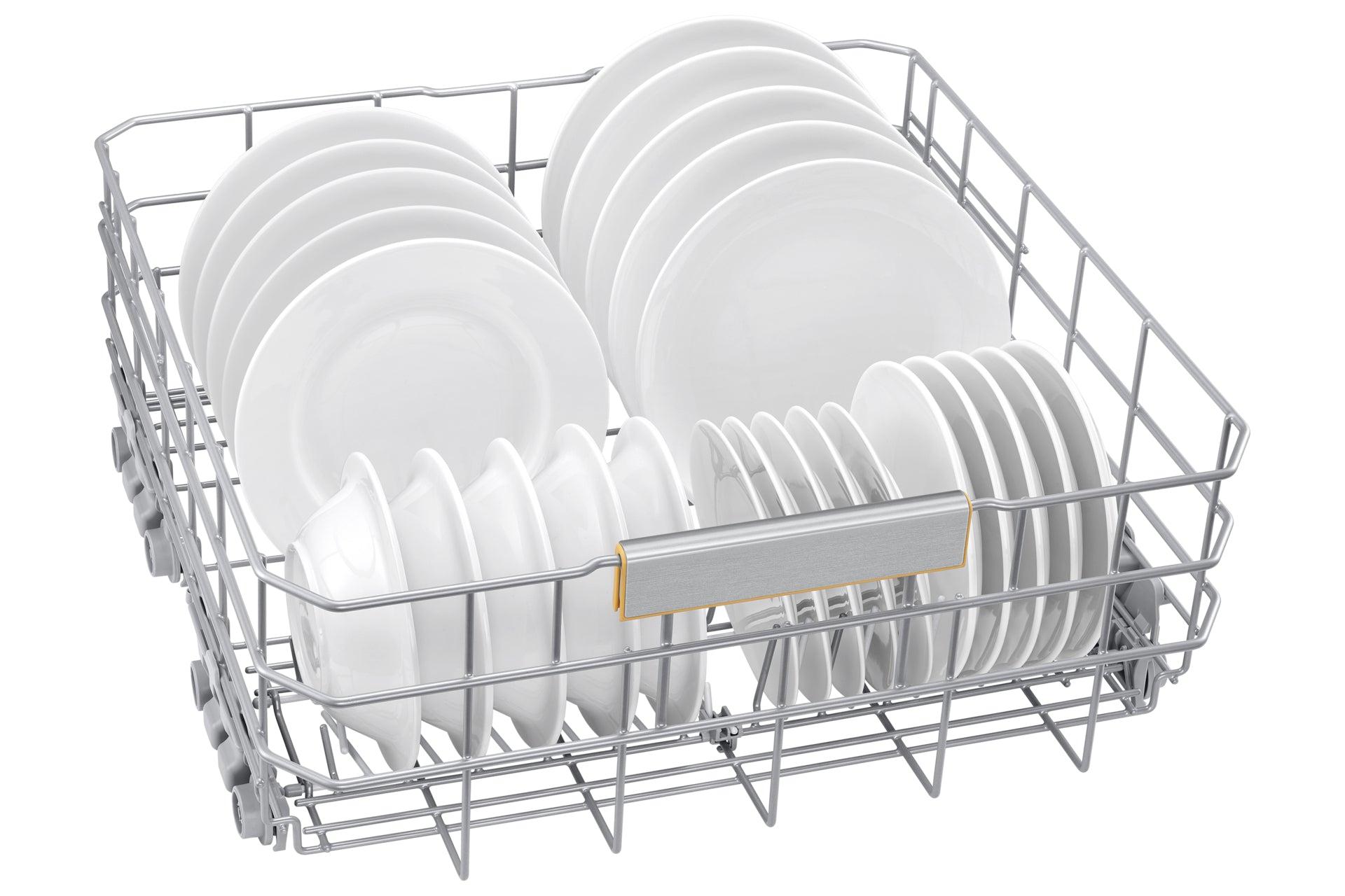 Gestione flessibile dello spazio| |Carico flessibile\nCarica piatti, bicchieri e tazze di diverse forme e dimensioni senza pensieri: il cestello centrale è regolabile in 3 diverse configurazioni grazie a una leva, ed è anche dotato di portabicchieri. Provvisto di denti ripiegabili, il cestello inferiore è perfetto per riporre piatti e ciotole in tutta sicurezza, mentre le stoviglie più grandi possono trovare posto sul fondo.
